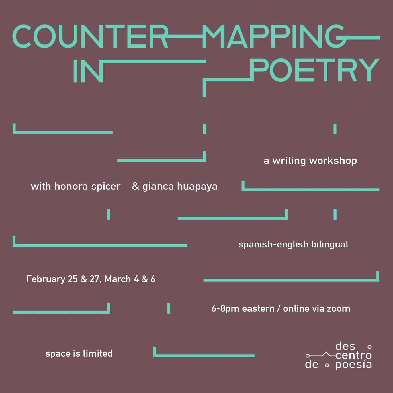 In this poetry workshop, we will investigate visual and textual forms of representing spaces at the intersection of poetry and cartography. Grounded in the visual/textual practice of poets and artists from the Latin American avant-garde, concrete poetry, documentary poetry, and critical cartography, we will excavate accumulations of power in public spaces to understand how what we can see has been formed, and how that formation affects our perception here and now. This workshop is designed for poets interested in integrating new tools, literary traditions, and spatial and ethical orientations in their practice, and to develop an investigative project about a place with which they are in relation. The workshop will be facilitated in Spanish and English, but participants do not need to be bilingual.